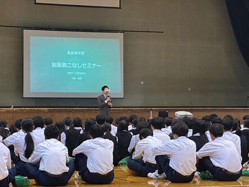 本校の制服を製作する宮城トンボ株式会社 より中森様にご来校いただき、生徒に向けて「制服の着こなし」についてご講話をいただきました。