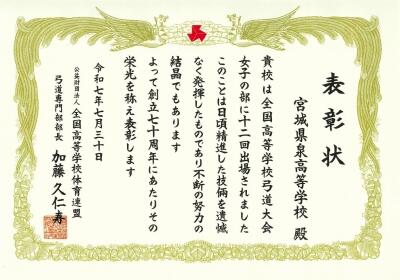 全国高等学校体育連盟弓道専門部創立70周年を記念して、本校弓道部女子が表彰されました。これは長年に亘り鍛錬を続けてきた多くの先輩方の成果が認められたものです。弓道部はこれからも日々稽古に励んでまいります。