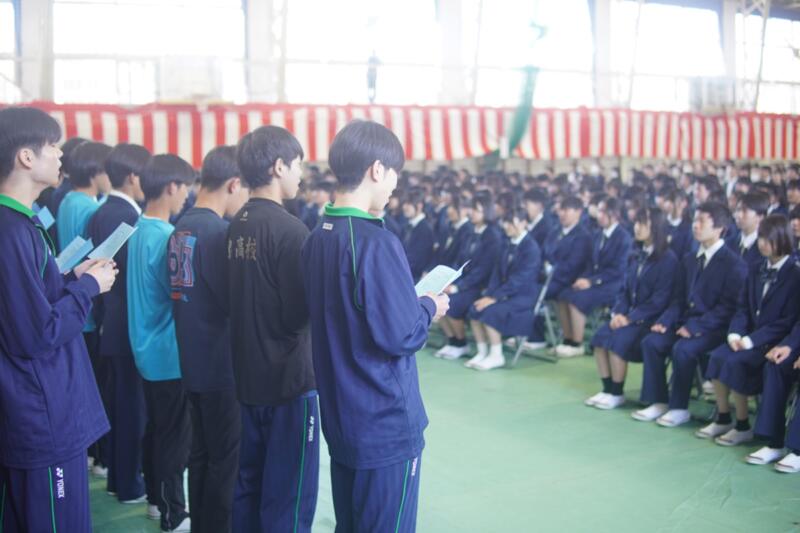 高校総体の報告会が開催され各運動部の代表から試合の結果報告と後輩たちへのメッセージが送られました。その後、今大会で入賞した弓道部と陸上部の表彰がありました。また、6月15日から山形県で開催される東北大会へ出場する陸上部の壮行式が行われ応援団からエールが送られました。