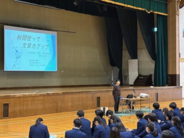 10月23日(木)7校時に、河北新報社記者の越中谷郁子様を講師にお迎えし、1年生向けの新聞記事に関する講演会が行われました。新聞記事の配置やその読み方等について説明がありました。また良い文章を書くためのポイントを解説いただきました。最後に昔話「桃太郎」をモチーフにした記事に見出しをつけるという課題が出され、生徒たちは一生懸命取り組みました。桃太郎側、鬼側では視点が変化し、見出しも180度変わることがわかり、生徒たちは驚いた様子でした。
